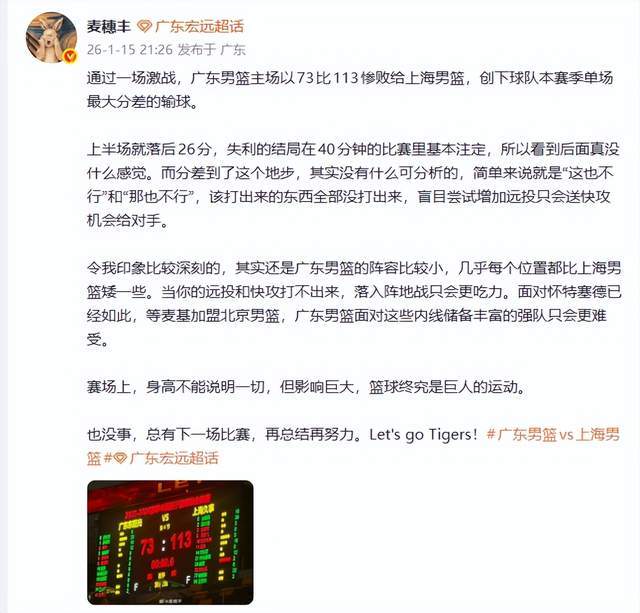 那么,广东队为何会输40分呢?赛后,广东媒体人麦穗丰给出了答案。在麦穗丰老师看来,“上半场就落后26分,失利的结局在40分钟的比赛里基本注定,所以看到后面真没什么感觉。而分差到了这个地步,其实没有什么可分析的,简单来说就是‘这也不行’和‘那也不行’,该打出来的东西全部没打出来,盲目尝试增加远投只会送快攻机会给对手。”